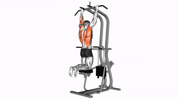 - Установите нужный вес на тренажёре: чем больше вес - тем больше поддержки при выполнении подтягивания. Возьмитесь за перекладину хватом сверху чуть шире ширины плеч и повисните на полном разгибании рук. Это ваше исходное положение.