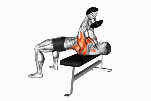 - Держа руки прямыми, медленно опускайте вес по дуге за голову, на вдохе, пока не почувствуете растяжение в мышцах груди.