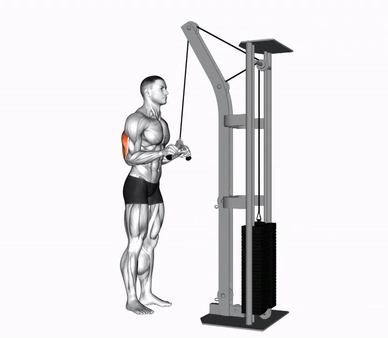Упражнение разгибание рук на верхнем блоке выполняются в блочном тренажёре (кроссовер) и направлено на тренировку трёхглавой мышцы плеча или трицепса.